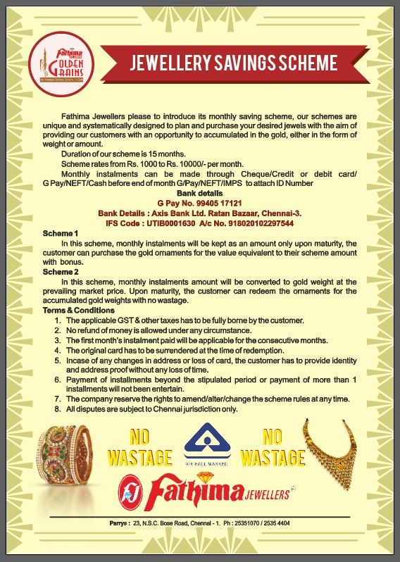 Fathima Jewellers proudly introduces its monthly saving schemes. Our schemes are unique and systematically designed to plan and purchase your desired jewels, providing an opportunity to accumulate gold in weight or value.